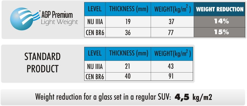 En un vehículo como una suburban regular, un set de vidrio blindado nivel CEN BR6 puede pesar alrededor de 400kg. Con la tecnología de light Weight nivel CEN BR6 se obtiene una reducción de hasta 63 kg.